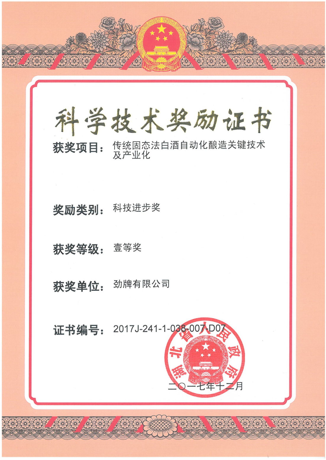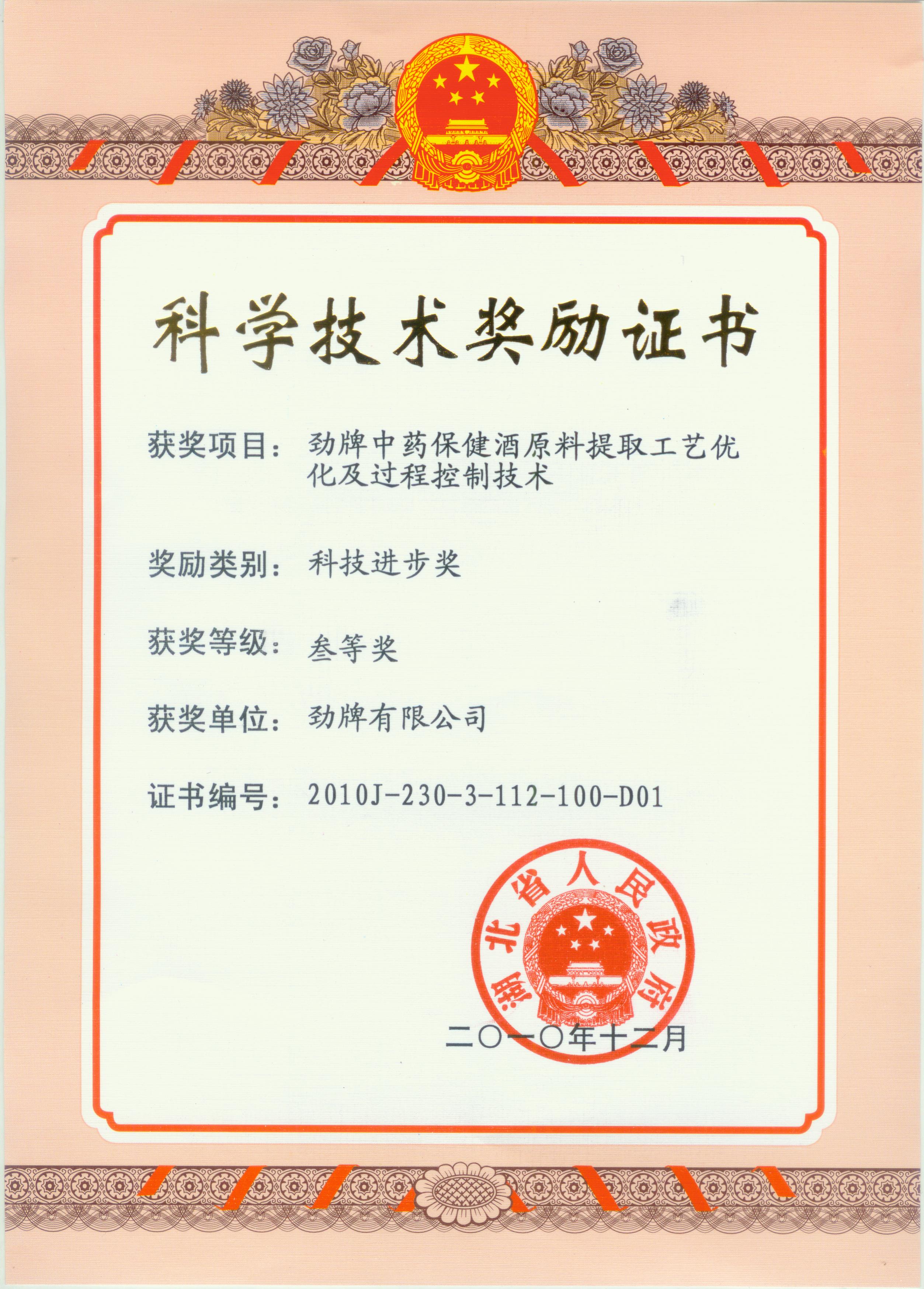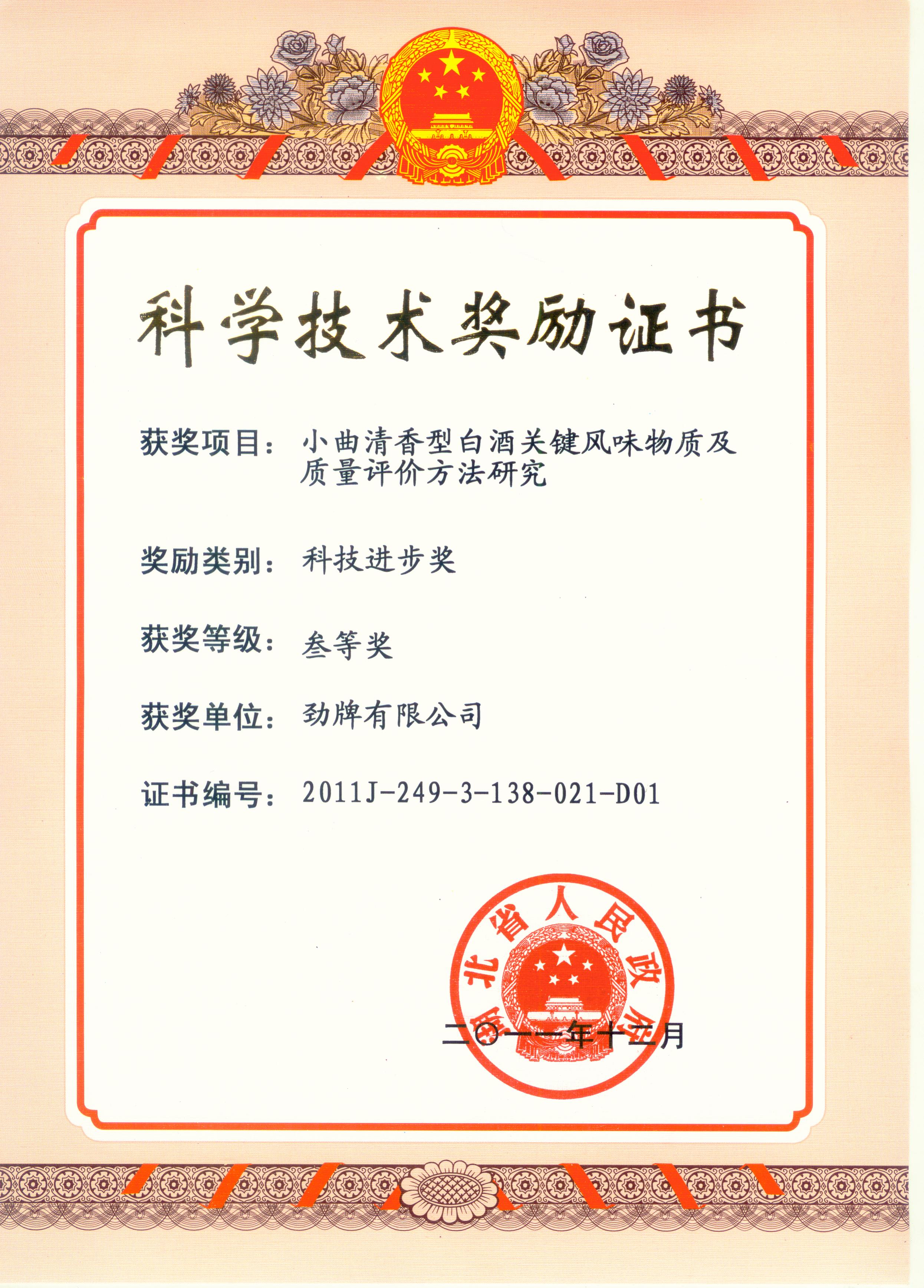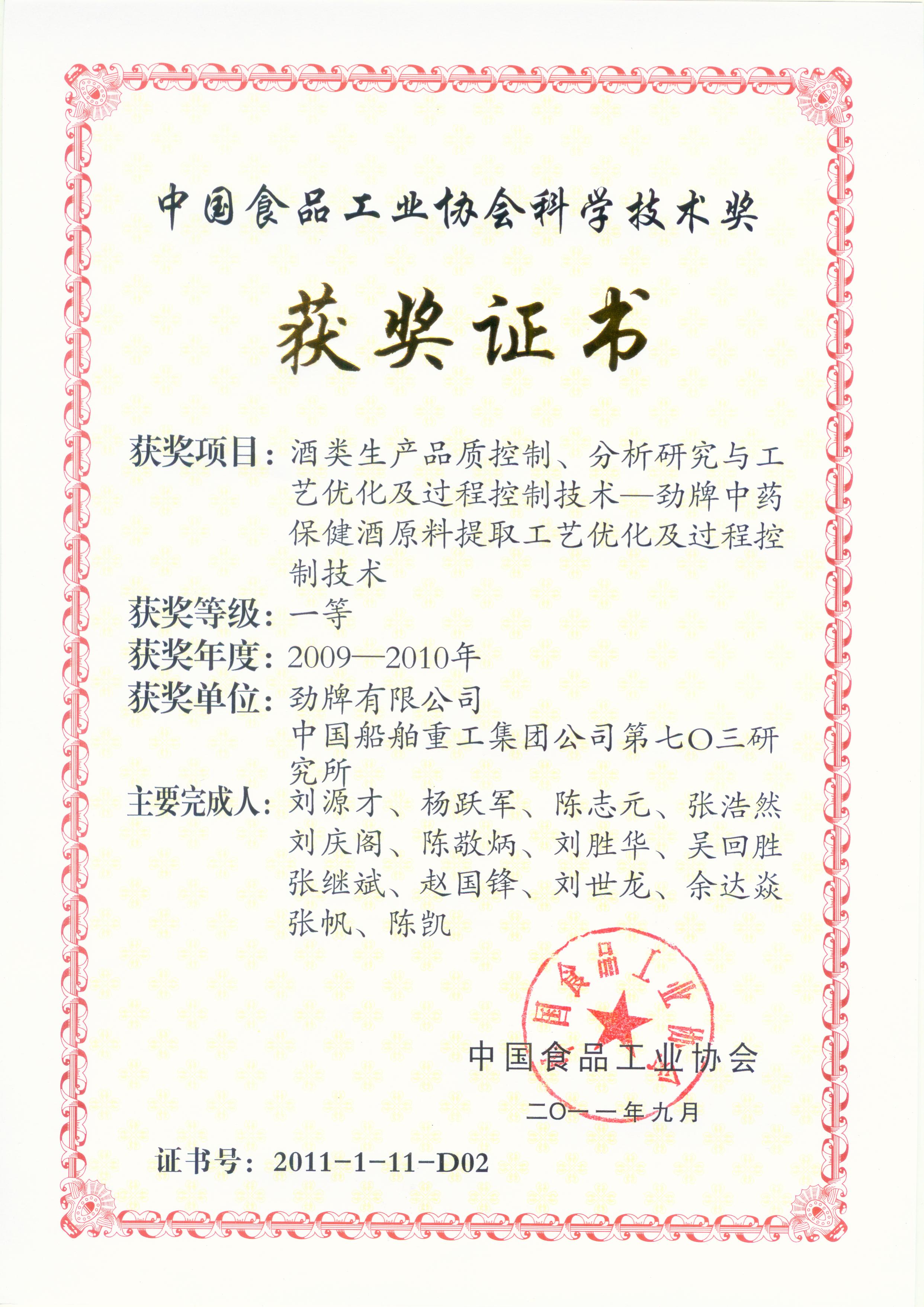 目前勁牌有限公司共獲得國家級、省級、行業級科技獎勵27項。其中國家級科技獎1項,省部級科技獎11項,行業級科技獎15項。